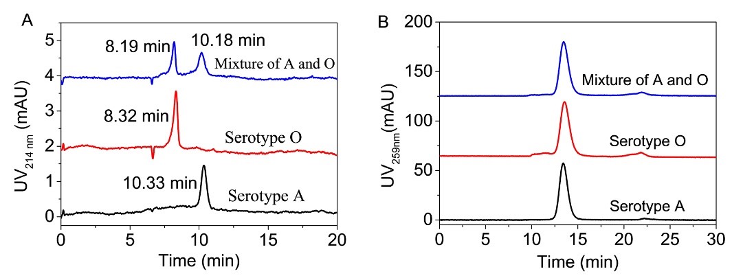 图3:(A)CZE及(B)HPSEC分别用于定量检测A型和O型单价、以及A/O双价FMDV