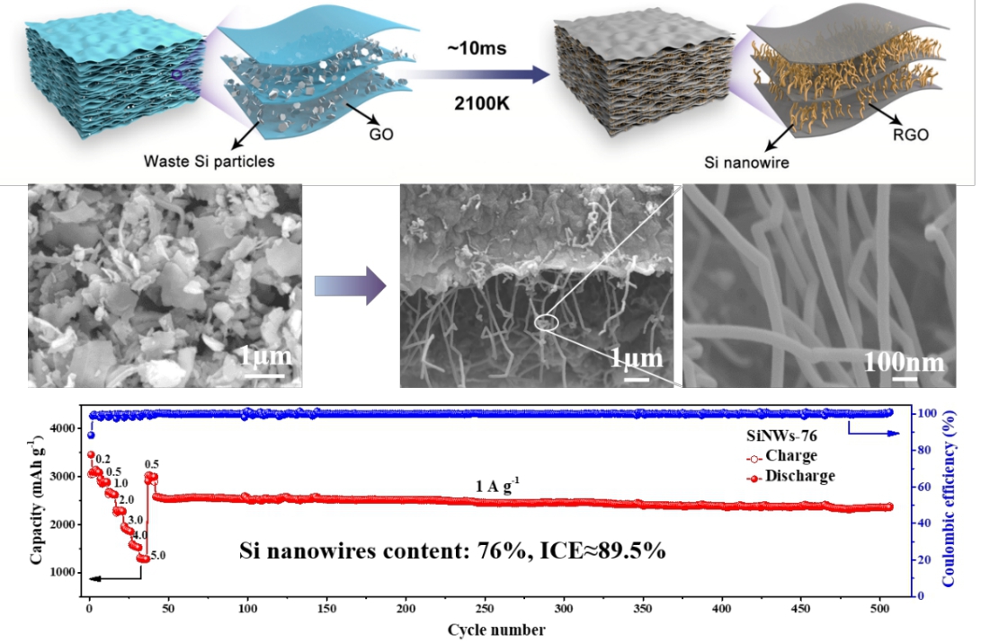 近年,在碳中和目标指引下,光伏太阳能产业发展迅猛,2020年全球硅片需求量已超160 GW。然而,在硅片制造过程中产生的硅废料每年可达20万吨。而且,目前仅能降级利用。为此,U9彩票王志研究员团队针对硅废料粒度细(~1μm)、氧化膜包裹和微量杂质夹带造成其高值化利用难的问题,提出了一种绿色、高效的增值循环再生策略,充分发挥硅废料氧化膜的限域和缺陷的诱导作用,通过闪速加热和淬冷提供大梯度热场(~105 K/s)驱动受限空间内硅原子的定向扩散以达到硅纳米线的快速生长,电极首效高达89.5%,循环超500次容量仍大于2300 mAh g-1,达到国际先进水平。