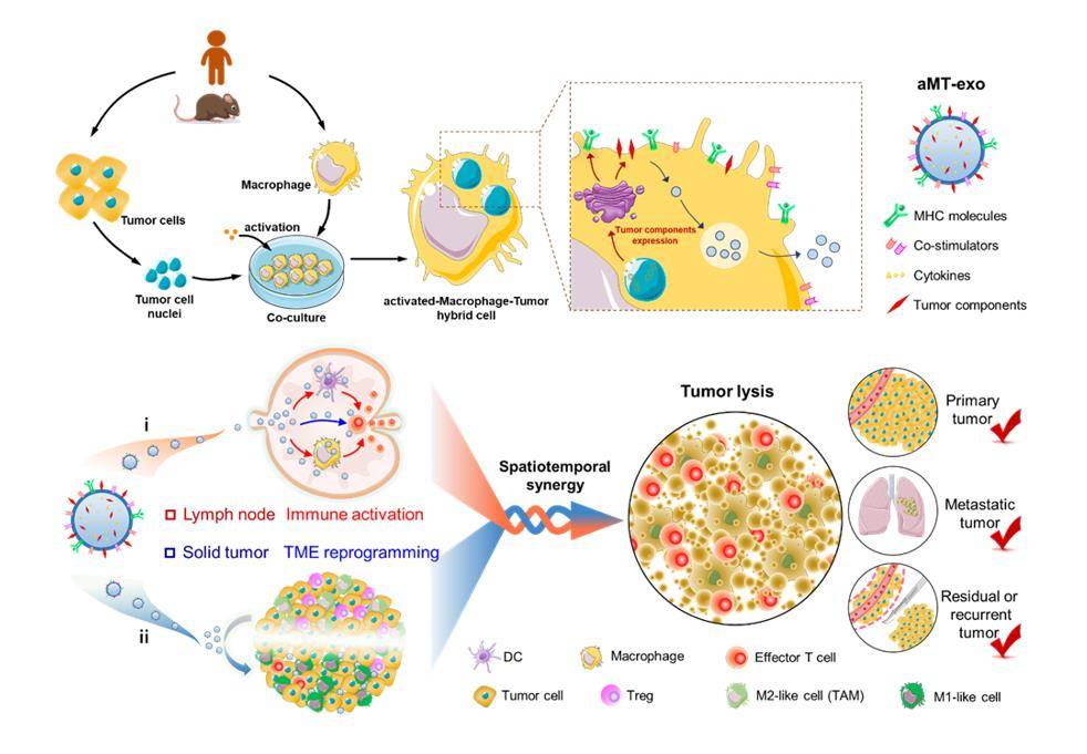 研究团队选择了具有强吞噬能力的巨噬细胞对肿瘤细胞核进行摄取,经过体外免疫驯化后形成免疫激活型巨噬-肿瘤杂合细胞。该细胞分泌的巨噬-肿瘤嵌合外泌体能够继承两种来源细胞的功能:一方面,借助纳米尺寸被动靶向淋巴结,依靠继承于巨噬细胞的表面抗原提呈信号和内部免疫激活因子,激活肿瘤特异性的免疫应答;另一方面,继承了肿瘤细胞的归巢能力,主动靶向到肿瘤组织,利用携带的免疫激活因子改善瘤内的免疫抑制微环境。通过上述空间双重靶向和机制双效协同的创新策略,能够最大程度保证效应T细胞在瘤内发挥免疫杀伤,显著提高免疫治疗效果。研究团队在淋巴瘤、乳腺癌、黑色素瘤多种类型的动物肿瘤模型上证明,嵌合外泌体可显著抑制原位肿瘤、转移性肿瘤及术后复发肿瘤的进展,效果远优于现有的肿瘤疫苗和T细胞回输策略。
