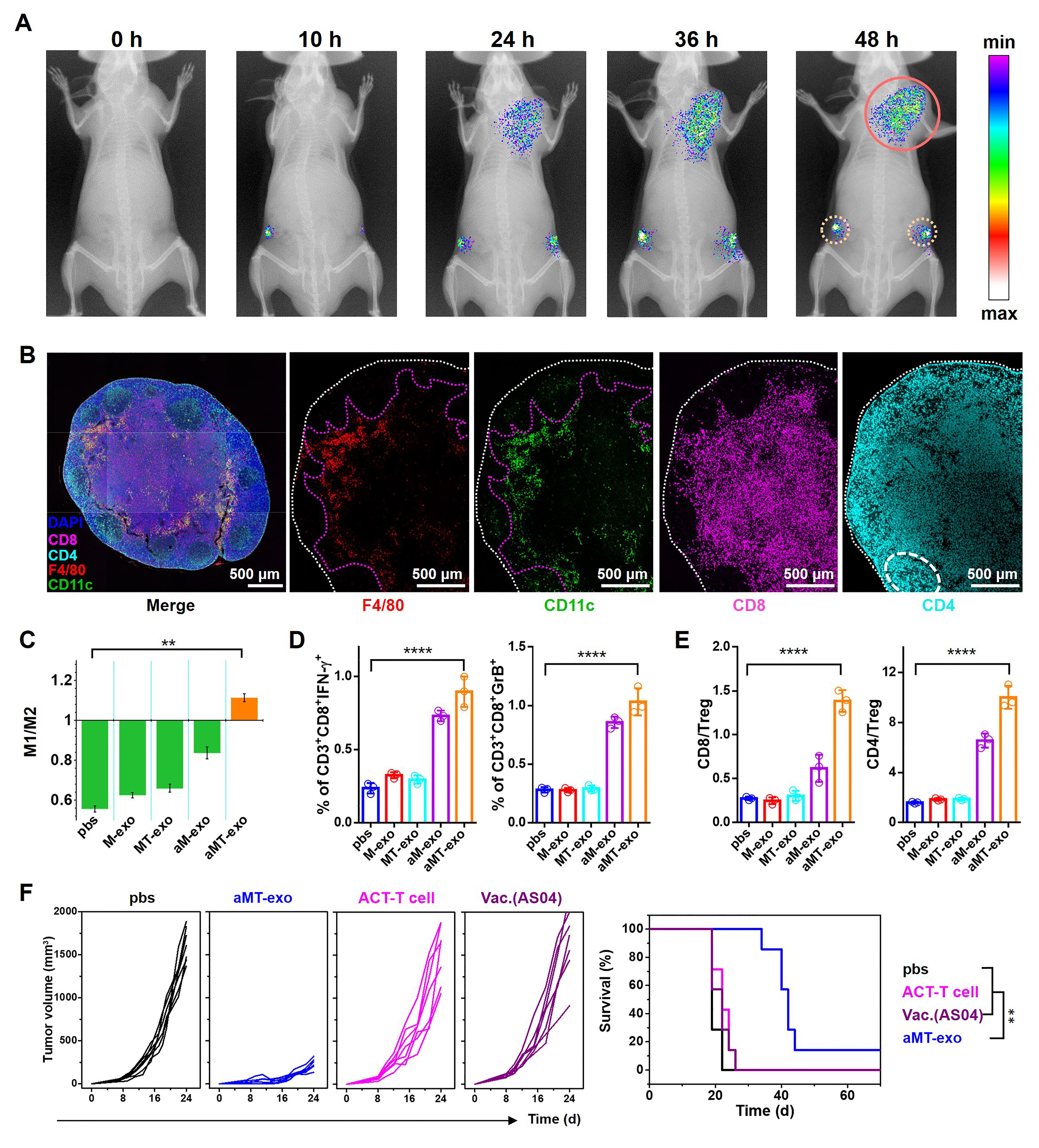 图2 嵌合外泌体的体内作用机制及在原位肿瘤模型上的疗效:(A)嵌合外泌体淋巴结-肿瘤双靶向的活体荧光成像;(B)嵌合外泌体激活淋巴结内免疫应答的免疫荧光切片;(C-E)嵌合外泌体在肿瘤内改善免疫抑制微环境;(F)不同治疗后小鼠原位肿瘤的生长曲线及生存期曲线