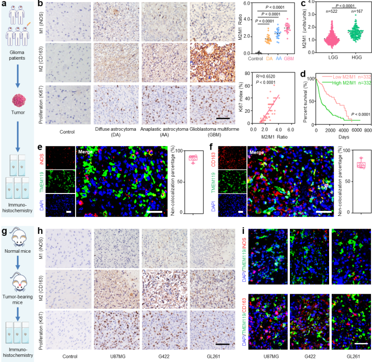 图1 胶质瘤样本中巨噬细胞的表型及其来源分析:a. 胶质瘤患者临床样本中巨噬细胞表型分析示意图;b. 不同级别胶质瘤中M1、M2和Ki67(细胞增殖指标)的分析;c. 基于TCGA数据库分析不同级别胶质瘤中M2/M1比例;d. 基于TCGA数据库分析胶质瘤患者瘤内M2/M1比例与生存曲线的关系;e. GBM组织中小胶质细胞和M1巨噬细胞的共定位分析;f. 免疫荧光染色分析GBM组织中小胶质细胞和M2巨噬细胞的共定位;g. 小鼠胶质瘤样本中巨噬细胞表型分析示意图;h. 在不同胶质瘤细胞系(U87MG、G422和GL261)中M1、M2和Ki67的分析;i. 免疫荧光染色分析不同鼠胶质瘤组织中小胶质细胞和M1或M2巨噬细胞的共定位情况;图中标尺均为50 μm