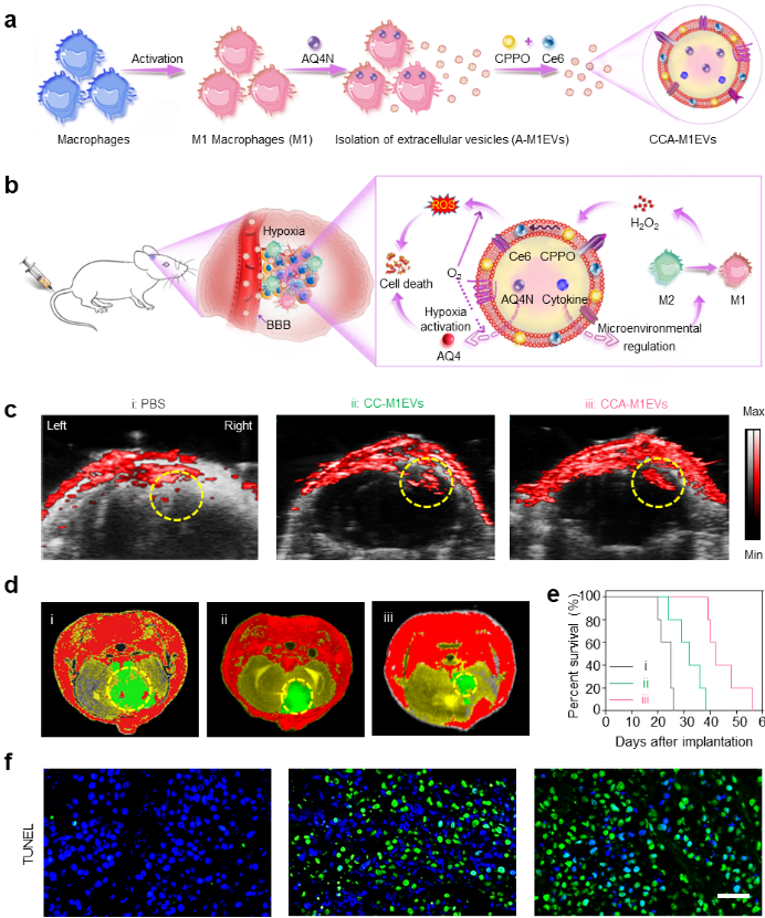 图2 基于M1EVs的仿生剂型构建方案、抗肿瘤机制及PDX疗效:a. 仿生剂型的构建示意图;b. 仿生剂型在GBM模型中的累积及免疫调节、化学激发动力学和乏氧触发化疗的协同作用示意图;c. 基于光声成像分析仿生剂型在PDX小鼠GBM病灶中的累积;d. 各组PDX小鼠的抑瘤效果(20天核磁成像);e. 各组PDX小鼠的生存期分析;f. 各组PDX小鼠的TUNEL分析(标尺50 μm)