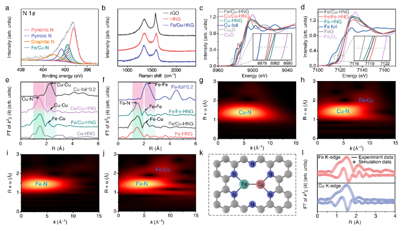 为了锚定双原子并形成金属-金属二聚体,研究人员首先在石墨烯中设计孔洞结构以产生大量的边缘位点,这些边缘位点被进一步氮化以结合Fe/Cu原子。通过形貌表征观察到大量双原子对,确定双原子位点的成功合成。通过价态分析与配位结构表征,确定杂原子双位点催化剂(Fe/Cu-HNG)中存在金属-N配位和异质金属-金属配位。同时进一步验证Fe/Cu-HNG的配位结构为Fe/Cu双原子锚定在MN2位点上,相邻的Fe/Cu原子结合在一起形成金属-金属二聚体结构(图3)。