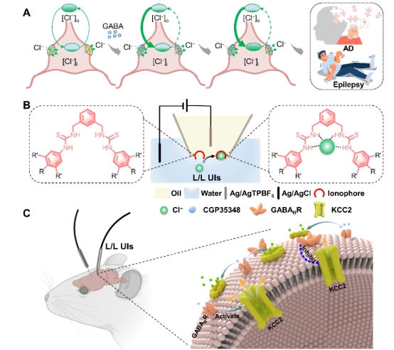 以电子为信号载体的传统电子器件(Electronics)仅能发生固/液界面上的电子转移反应,与之不同的离电器件(Iontronics)以离子作为信号载体,其与组织之间形成的液/液界面上不仅能发生电子转移,还能发生离子转移。研究人员首先在脑组织中构筑超微液/液界面,同时,将设计的可识别Cl-的双硫脲离子载体(IPECl-1, IPECl-2, IPECl-3)修饰在界面处,并将填充有机凝胶的超微玻璃电极尖端植入,构筑出用于生理环境下监测Cl-的超微液/液界面离电器件(L/L UIs)。首次在生理环境下对非电化学活性的Cl-实现了高灵敏、抗干扰、可逆、实时的动态追踪。随后,研究人员通过将L/L UIs精准植入到阿尔茨海默模型小鼠和癫痫模型大鼠的海马体、纹状体及皮层等特定脑区中,探究不同脑区之间Cl-浓度的差异。通过在阿尔茨海默模型小鼠的活体脑内动态追踪Cl-,L/L UIs证明了在神经抑制过程中扮演重要角色的钾-氯-共转运体2(KCC2)对脑内的Cl-浓度具有调控作用。