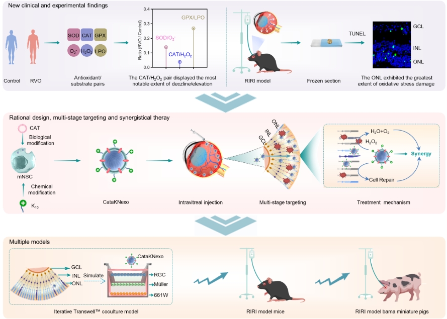 针对上述挑战,生物药制备与递送全国重点实验室主任魏炜,中国科学院院士、U9彩票研究员马光辉与北京朝阳医院眼科主任陶勇教授团队展开深入合作,基于临床发现,提出了工程化外泌体治疗RIRI的新策略。通过对大量RIRI患者的玻璃体液样本研究,团队发现这些样本的过氧化氢水平大幅升高且过氧化氢酶活性明显降低,二者失衡程度显著高于其他氧化应激指标,为团队提供了抗氧化应激损伤的靶标。在小鼠模型中,团队进一步验证了上述发现,并观察到视网膜外核层是氧化应激损伤最严重的区域。在此基础上,团队创新设计了聚赖氨酸(K10)修饰和过氧化氢酶表达的神经干细胞外泌体(CataKNexo)。经玻璃体腔注射后,CataKNexo能够富集到视网膜节细胞层,随后借助K10的渗透作用有效到达外核层,利用过氧化氢酶的抗氧化功能和神经干细胞外泌体的神经保护作用,实现协同治疗。