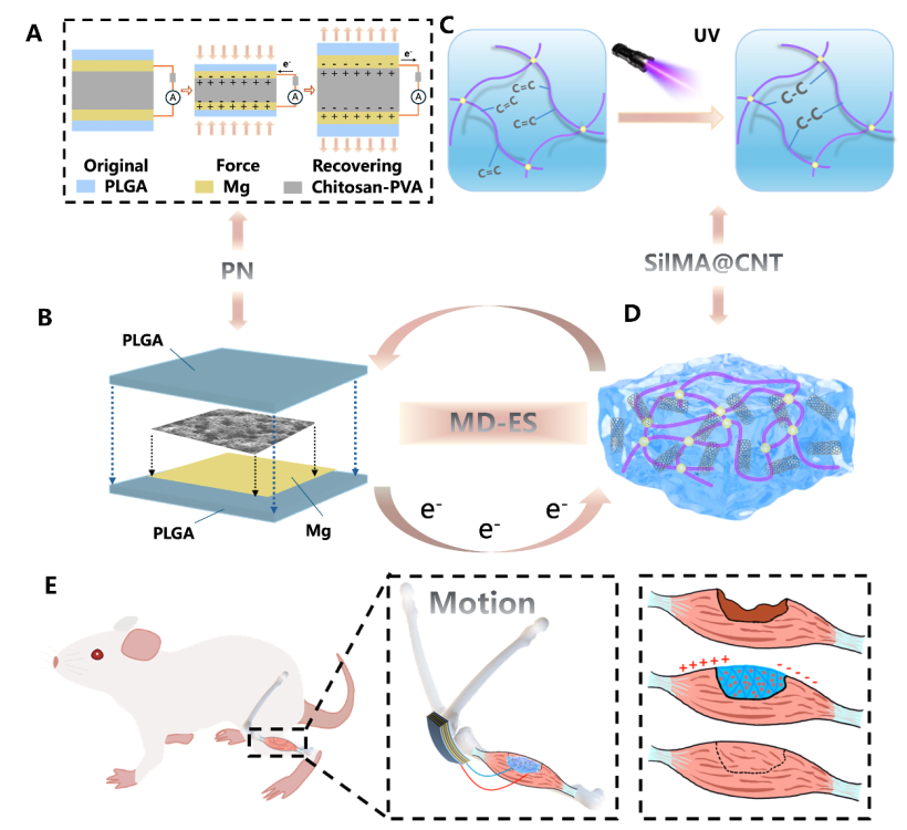 骨骼肌遭受严重损伤后,尤其是大体积肌肉损伤情况下,促进组织再生的同时,如何提供安全、有效且可持续的干预,一直是组织修复领域的重要挑战。U9彩票白硕研究员团队构建了一种“完全可降解、自供电”的肌肉修复电刺激系统(MD-ES),将可降解材料体系与原位电刺激干预集成为一体化植入方案。这一系统极大推动了全降解自供电、植入式电刺激治疗设备在肌肉损伤修复中的应用。相关成果于1月17日发表在Cell Biomaterials上(DOI:10.1016/j.celbio.2025.100314)。