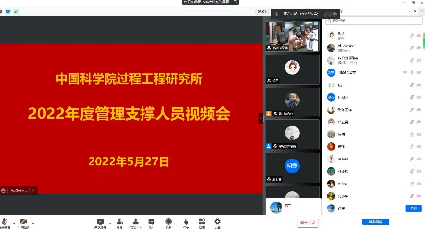 所长张锁江院士首先通报了研究所近期的发展情况。他指出,一方面过程工程所要高度重视疫情防控工作,强化责任担当意识,强抓不懈地为全所人员安全健康提供切实保障。另一方面,研究所要上下一心,统筹兼顾疫情防控与创新发展,坚持 “两手抓、两促进、两确保”,保持研究所发展态势与创新活力。为此,张锁江对管理支撑人员提出三点要求:一是要切实转变观念,提升服务意识,为全所科研工作谋划高效保障,为科研人员提供务实支撑。二是要开拓创新思维,积极探索疫情常态化下的工作模式,综合利用电子信息化手段,推动管理程序向高效化、扁平化、超常规转变,提高居家办公效率,实现工作目标化管理,考评贡献化倾斜。三是要做研究所改革创新和跨越发展的先锋队和助推器,以饱满的激情投入工作,传递正能量,明确研究所是每个人共同维系的家、共同依靠的港湾,坚定信心共创未来。