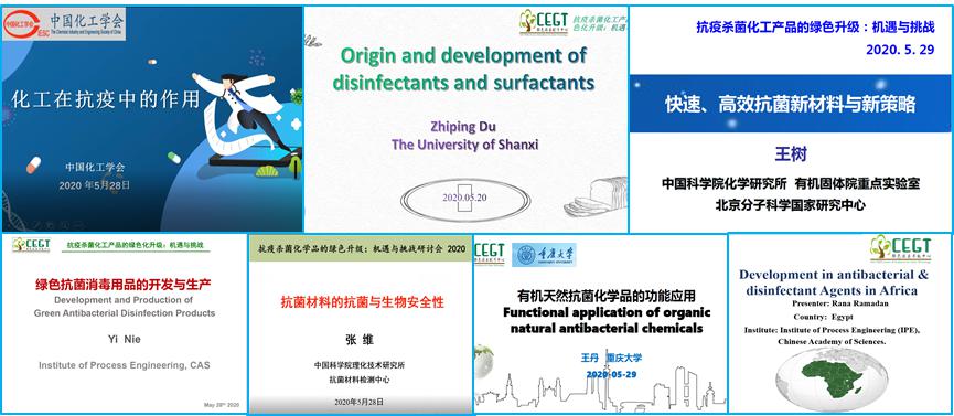 会议中,中国化工学会张颖教授级高工以“化工在抗疫中的作用”为题,分享了化工行业在本次抗击疫情战斗中发挥的巨大能量,提出了调整产品结构,提倡清洁生产,让化工生产实现可持续发展的新目标。中科院理化所张维研究员以“抗菌材料的抗菌与生物安全性”为题,提出了阳离子表面赋予材料抗菌与生物相容性的新思路。中科院过程所聂毅研究员做了题为“绿色抗菌消毒用品的开发与生产”主题报告,介绍了中科院过程所新兴产业技术研究院自主研发的添加了青蒿蜡油、芦荟苷、杜仲京尼平苷、栀子花精油等天然活性组分,具有抑菌、消毒、驱虫、保湿、护肤多重功效的新型消毒免洗凝胶。中科院化学所王树研究员以“快速、高效抗菌新材料与新策略”为题,介绍了通过杀菌剂与细胞膜表面相互作用,产生活性氧将细菌杀灭,从而避免细菌产生耐药性的抗菌机理与策略。中国日化工业研究院杜志平教授级高工以“消毒剂与表面活性剂的过去和未来”为题,详细介绍了表面活性剂对消毒剂功效的协同强化作用。重庆大学王丹副教授以“天然有机抗菌化学品的功能应用”为主题进行报告,提出了以壳聚糖为原料的新型天然有机抗菌剂的设计制备新思路和新方法。埃及的Rana Ramadan博士,做了题为“抗菌消毒剂在非洲的发展”的报告,详细介绍了抗菌消毒剂在非洲的发展历史和现状。