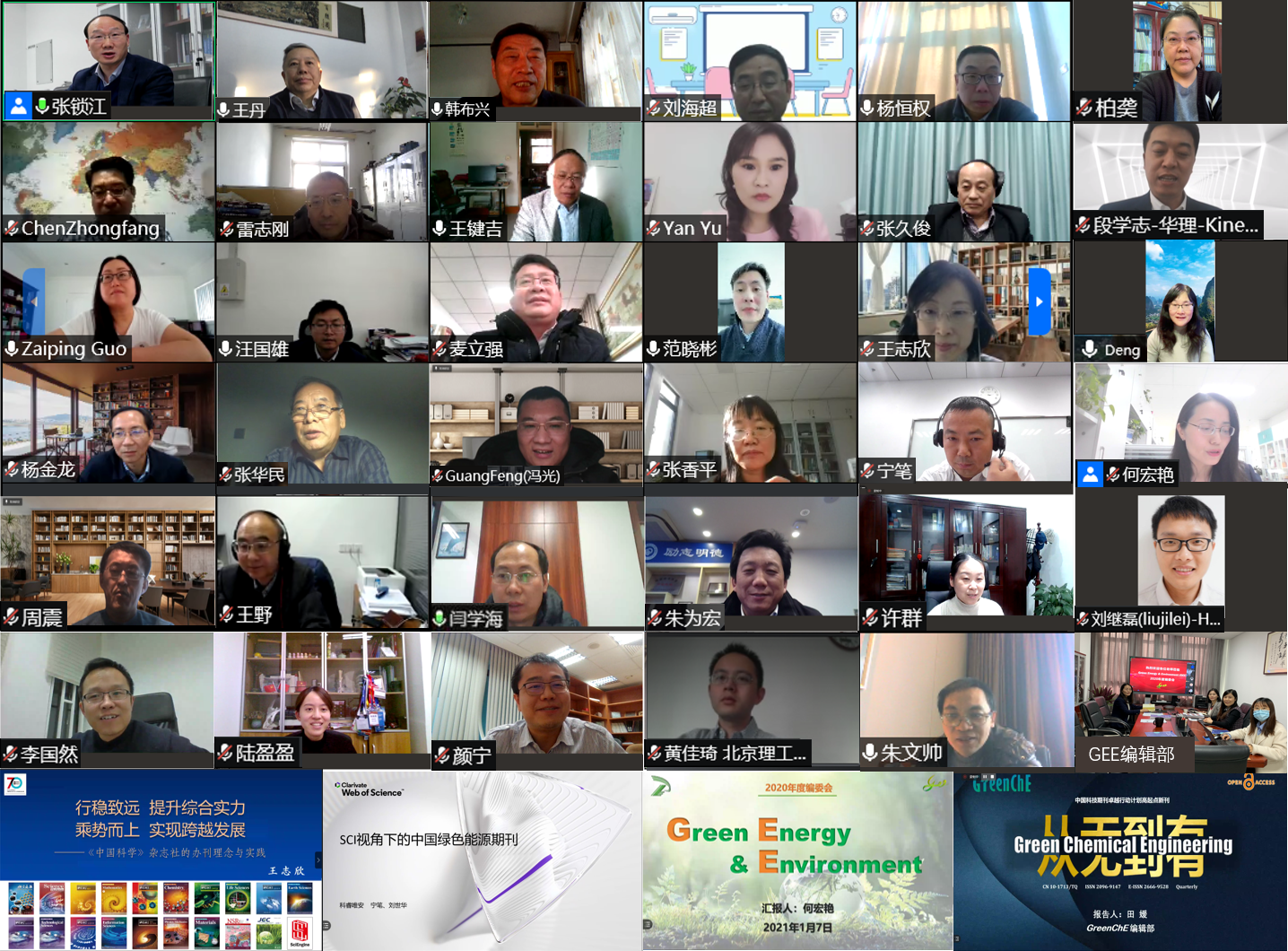 1月7日,Green Energy & Environment (GEE) 2020年度编委会以线上形式成功召开。会议由GEE主编张锁江院士主持,顾问编委韩布兴院士,副主编张久俊院士、王键吉教授、刘海超教授、周震教授、陈中方教授、闫学海教授,及编委、青年编委、特邀专家、《中国科学》杂志社总经理王志欣总经理、科睿唯安总监宁笔总监和GEE编辑部成员等50余人线上参会。
