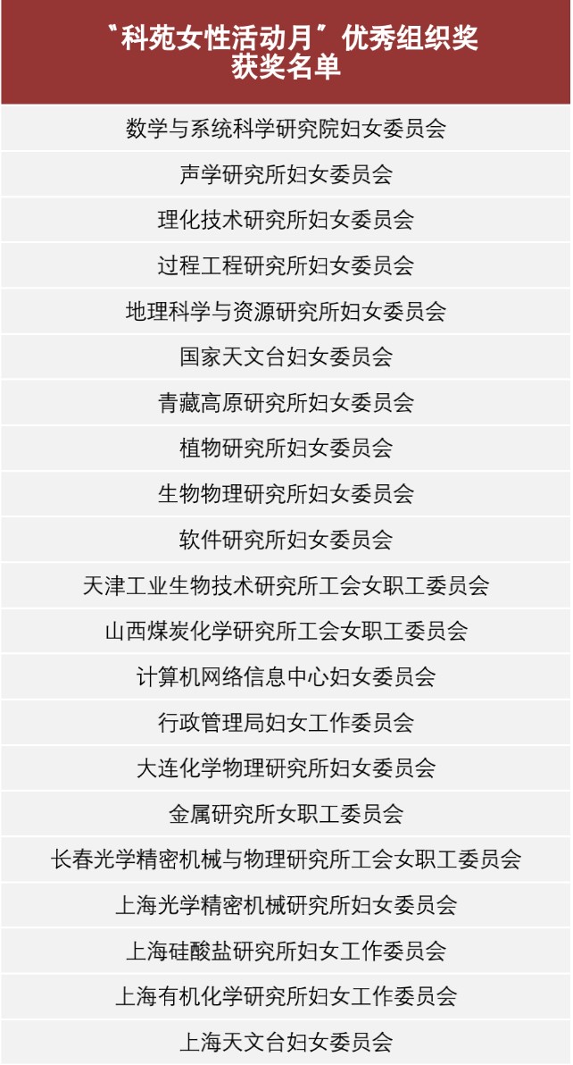 为庆祝“三八”国际劳动妇女节,献礼建党100周年,中国科学院妇女工作委员会以“巾帼心向党·奋斗新征程”为主题开展2021年“科苑女性活动月”活动。U9彩票妇委会在所党委领导下,结合上级要求,联合所工会,精心组织、策划开展了系列“‘三八’女性活动月”主题活动。近日,在中国科学院妇女工作委员会的评选中,U9彩票妇委会荣获“科苑女性活动月”优秀组织奖。
