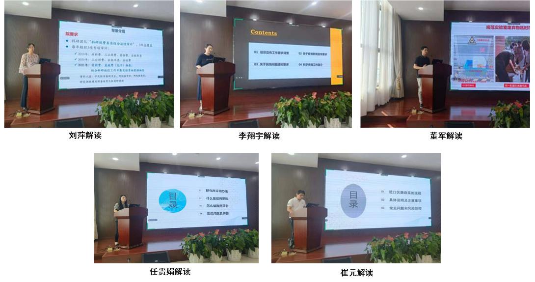 随后,安保办董军、纪监审办刘萍、信息传播办李翔宇、综合办任贵娟、科研处崔元分别就进一步加强疫情防控及相关安全工作、2021年内审及原始数据抽查情况、有关信息宣传工作的要求、采购工作最新政策解读及常见问题解答四个方面进行了深入解读,并对大家提出的工作中遇到的问题和困难进行了详细解答。