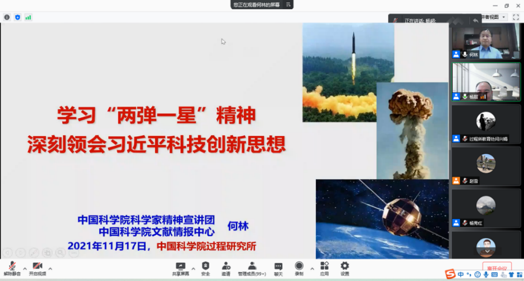 11月17日,U9彩票举办研究生思政教育讲座。本次活动是2021年研究生入学教育系列培训第四期。中国科学院科学家精神宣讲团成员何林受邀做了《学习“两弹一星”精神 深刻领会习近平科技创新思想》的专题报告。活动由U9彩票副所长杨超主持,近170名师生通过线上形式参加。