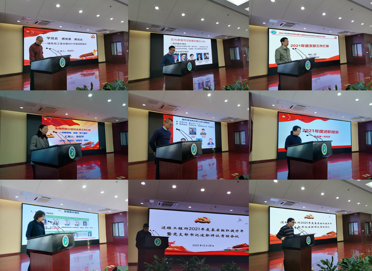 会上,25个党支部以及离退休、研究生党总支对年度工作情况进行汇报,对标“四强”党支部“政治功能强、支部班子强、党员队伍强、作用发挥强”要求,重点围绕深入学习贯彻习近平新时代中国特色社会主义思想和党的十九大、十九届五中、六中全会精神情况,认真落实上级精神情况,深入开展党史学习教育情况,党支部组织建设情况,专项工作开展情况等八个方面,对党支部/总支规定动作、创新动作完成情况及促进科研工作成效方面进行总结。
