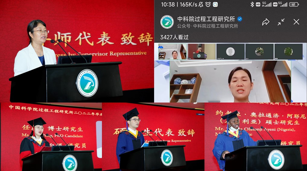 导师代表张香平研究员在发言中,以“志高、勤学、奋斗”鼓励同学们,希望大家志存高远,勤学不殆,坚守初心不断奋斗,感恩师长父母,回报社会,早日成为国之栋梁。任朋、陶忍、约书亚·奥拉通济·阿耶尼(Joshua Olatunji Ayeni)分别作为博士生、硕士生和留学生代表发言,共同表达了对导师和研究所的感谢。车辕金女士代表毕业生家属为同学们送上了真挚的祝福。在“过程慢递”环节,杨超副所长与6名毕业生代表共同回忆了这几年的读书经历和收获,一起憧憬美好未来。毕业生代表王一童和毛寒成通过一曲《飞云之下》表达了对全体毕业生的美好祝愿。