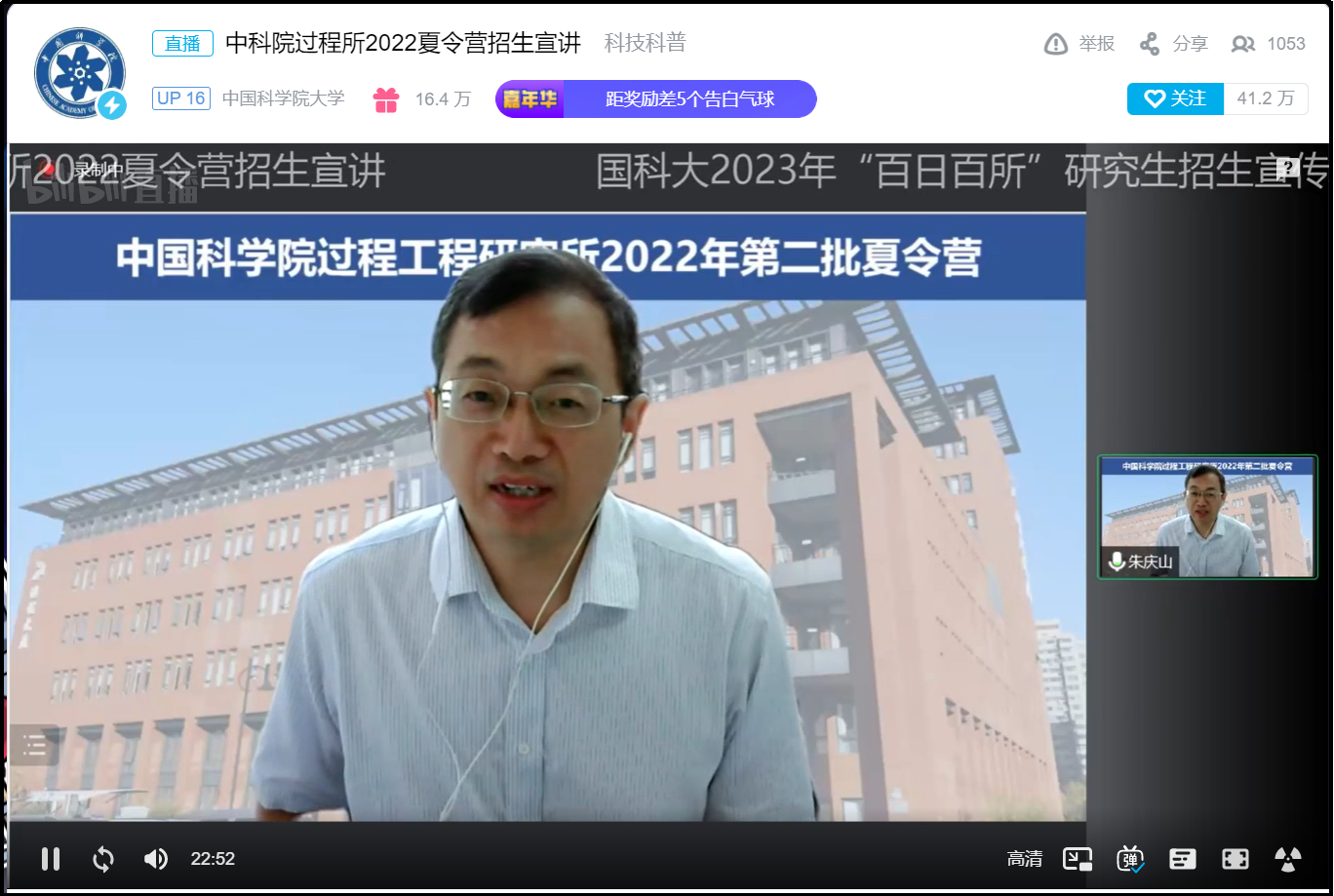 8月18日至24日,U9彩票2022年度第二批优秀大学生夏令营活动顺利举办。所长张锁江院士,党委书记、副所长朱庆山研究员,副所长杨超研究员以及研究所12个研究部的60余名导师参加,来自全国82所高校的156名营员以及300余名合作高校学生共同参与了此次线上夏令营。