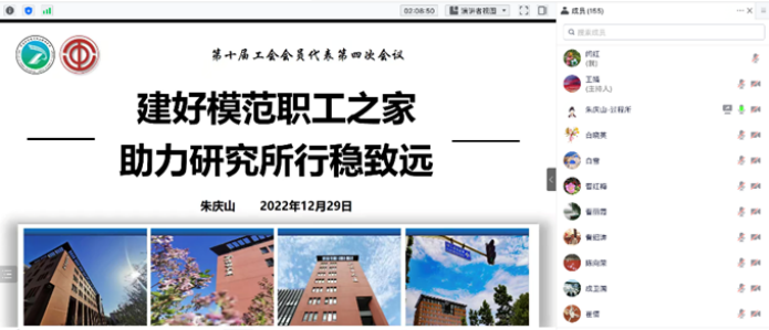 朱庆山做最后总结发言,希望各位职代表、工代表从全所角度出发,履职担当,深入思考关乎职工利益和全所未来发展的意见建议,站在研究所改革创新、国家自立自强的角度,集思广益、建言献策,团结一致、努力奋斗,为研究所发展贡献智慧力量,并祝大家元旦快乐,身体健康。