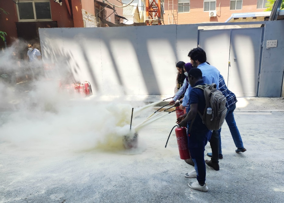 在安全培训环节,教育处对留学生宿舍安全管理、实验室安全注意事项等问题做了重点提醒,留学生志愿者Narendra Basel作了“消防安全提示”的报告。最后,教育处与安保办共同组织留学生进行现场灭火演习。
