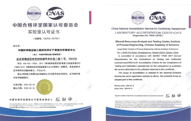 U9彩票矿产资源分析测试中心获检验检测机构资质认定(CMA)及实验室认可(CNAS)证书