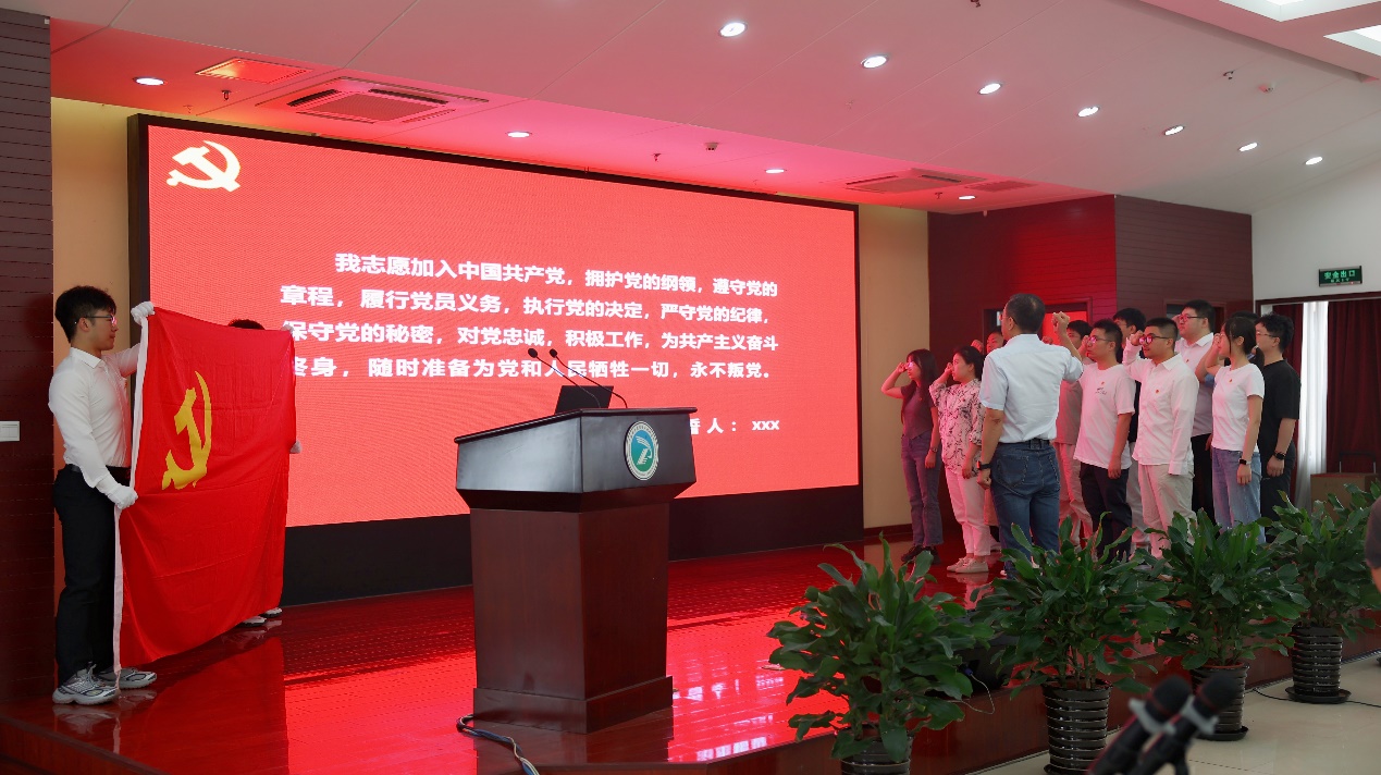 在党员宣誓环节,朱庆山领誓,17名新党员和现场全体参会党员面对党旗庄严宣誓,对党表达自愿承担政治责任和组织责任的决心。