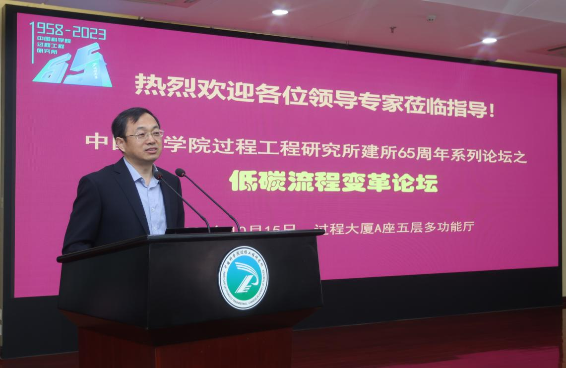 过程工程研究所党委书记、副所长朱庆山致辞。他首先对各位专家的到来表示热烈欢迎与由衷感谢。随后对研究所的成立背景和建所65周年以来的发展历程进行了介绍,希望本次论坛能够搭建低碳科学前沿多学科交叉的交流平台,为实现过程工业“双碳”目标和可持续发展贡献智慧。